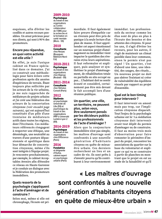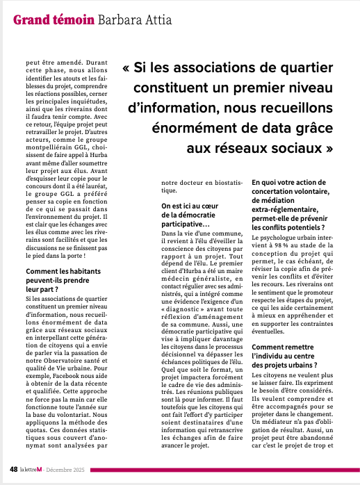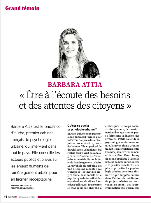 Dans un contexte où les projets d’aménagement font face à des défis d’acceptabilité croissants, une nouvelle discipline émerge pour apaiser les tensions : la psychologie urbaine. Barbara Attia, fondatrice du cabinet Hurba, nous explique comment l’écoute active et la médiation citoyenne deviennent des leviers indispensables pour les promoteurs et les élus. Une interview passionnante sur la fabrique de la ville humaine, initialement publiée dans La Lettre M (décembre 2025).